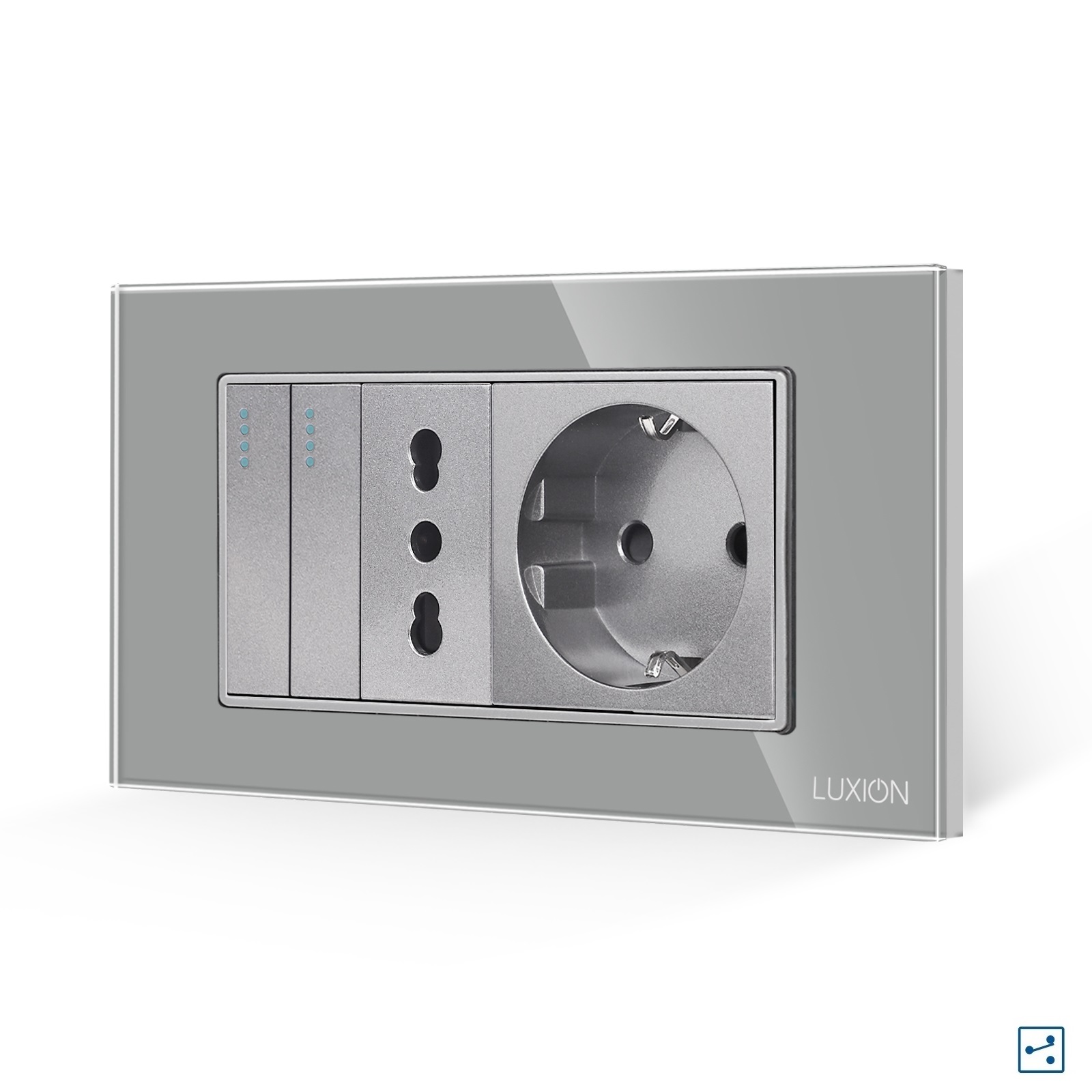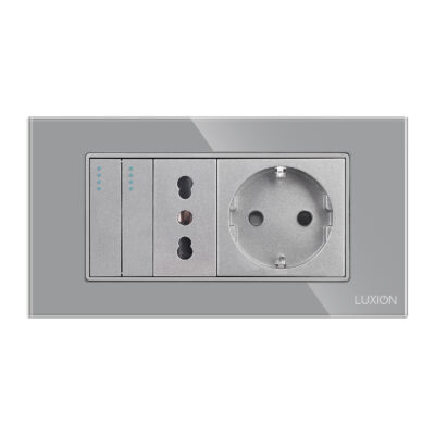 Doppio deviatore + presa stretta + presa Schuko con placca in vetro LUXION, standard italiano, 4M